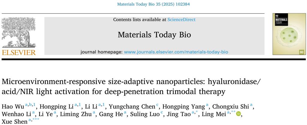 教师沈雪博士及其实验室团队在中科院1区Top期刊Materials Today Bio(IF=10.2)发表题为“Microenvironment-responsive size-adaptive nanoparticles: hyaluronidase/acid/NIR light activation for deep-penetration trimodal therapy”的研究论文。学生吴昊、李红萍、李黎为该论文的共同第一作者,我校教师陶静副研究员、梅凌副研究员、沈雪助理研究员为该论文的共同通讯作者,成都大学为该成果的第一单位。